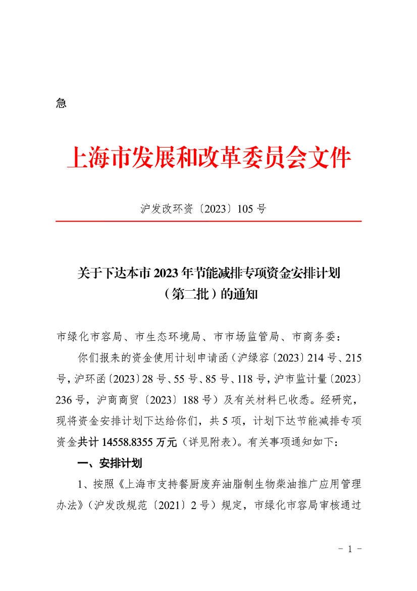 1、按照《上海市支持餐厨废弃油脂制生物柴油推广应用管理办法》(沪发改规范〔2021〕2号)规定,市绿化市容局审核通过的2家单位B5生物柴油销售2023年1月-3月补贴资金,合计3631.6019万元。