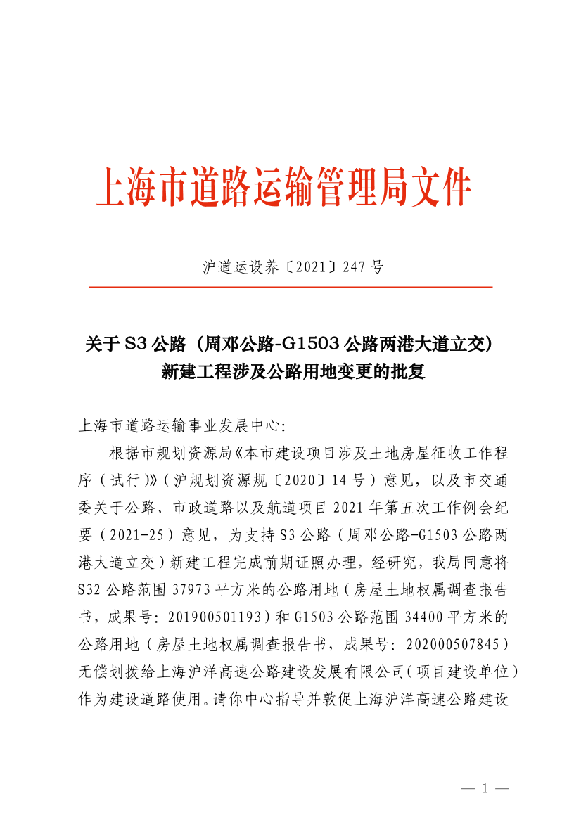根据市规划资源局《本市建设项目涉及土地房屋征收工作程序(试行)》(沪规划资源规〔2020〕14号)意见,以及市交通委关于公路、市政道路以及航道项目2021年第五次工作例会纪要(2021-25)意见,为支持S3公路(周邓公路-G1503公路两港大道立交)新建工程完成前期证照办理,经研究,我局同意将S32公路范围37973平方米的公路用地(房屋土地权属调查报告书,成果号:201900501193)和G1503公路范围34400平方米的公路用地(房屋土地权属调查报告书,成果号:202000507845)无偿划拨给上海沪洋高速公路建设发展有限公司(项目建设单位)作为建设道路使用。请你中心指导并敦促上海沪洋高速公路建设发展有限公司做好后续S3公路设施移交及资产登记等相关工作。原用地批复文件《关于S3公路(周邓公路-G1503公路两港大道立交)新建工程涉及公路用地的批复》(沪道运设养〔2020〕185号)即行废止。