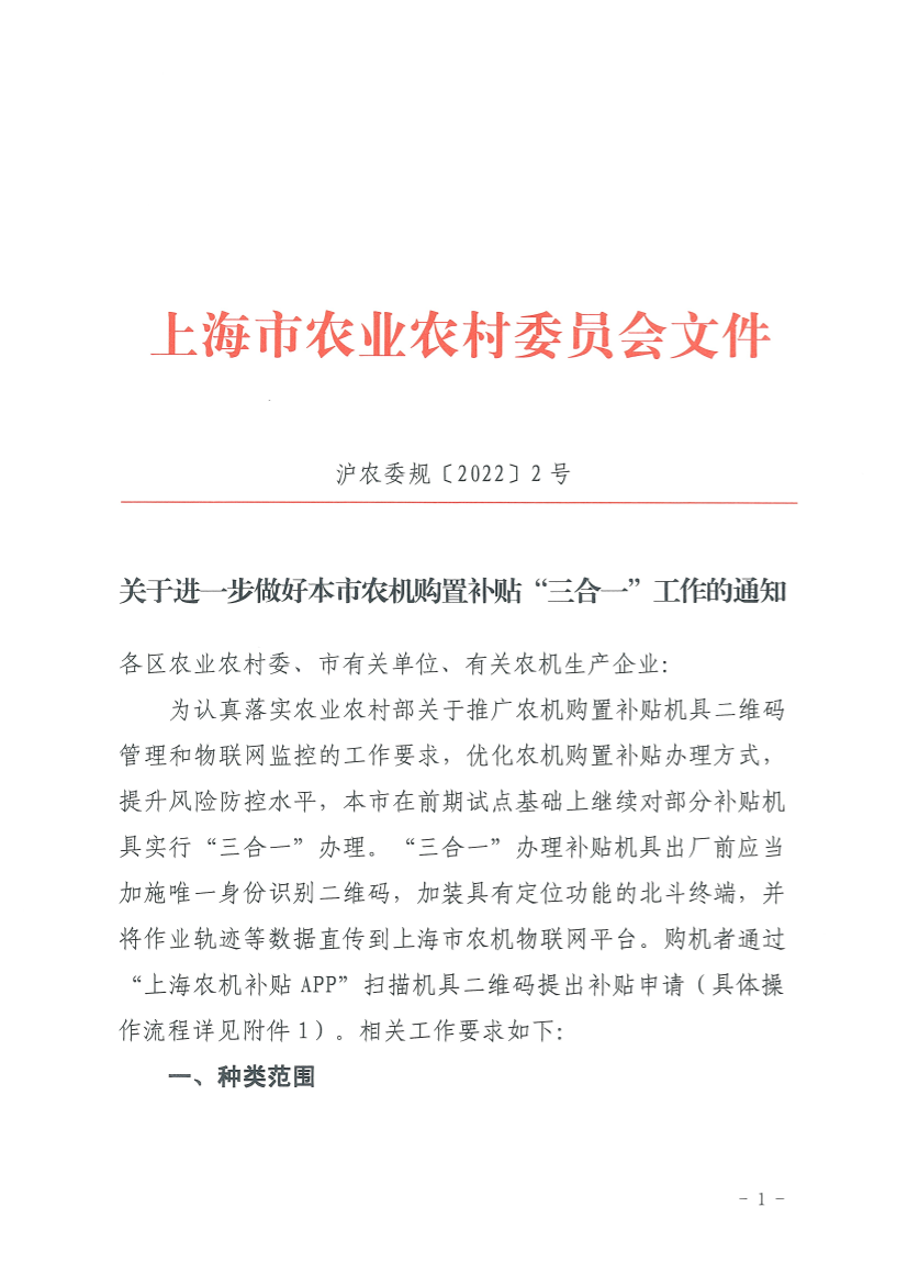为认真落实农业农村部关于推广农机购置补贴机具二维码管理和物联网监控的工作要求,优化农机购置补贴办理方式,提升风险防控水平,本市在前期试点基础上继续对部分补贴机具实行“三合一”办理。“三合一”办理补贴机具出厂前应当加施唯一身份识别二维码,加装具有定位功能的北斗终端,并将作业轨迹等数据直传到上海市农机物联网平台。购机者通过“上海农机补贴APP”扫描机具二维码提出补贴申请(具体操作流程详见附件1)。相关工作要求如下: