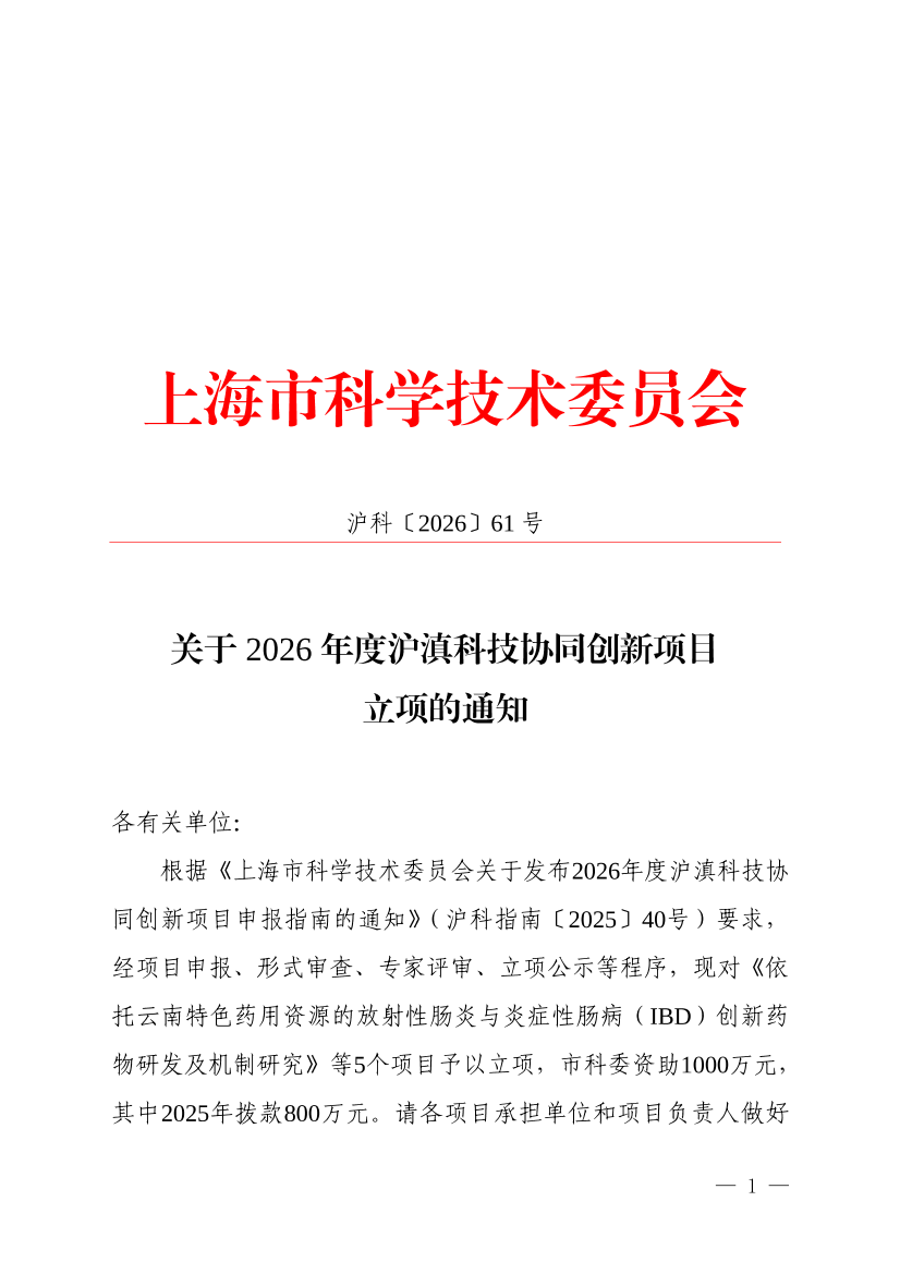根据《上海市科学技术委员会关于发布2026年度沪滇科技协同创新项目申报指南的通知》(沪科指南〔2025〕40号)要求,经项目申报、形式审查、专家评审、立项公示等程序,现对《依托云南特色药用资源的放射性肠炎与炎症性肠病(IBD)创新药物研发及机制研究》等5个项目予以立项,市科委资助1000万元,其中2025年拨款800万元。请各项目承担单位和项目负责人做好项目组织实施和管理工作,确保按期完成项目研究任务目标。