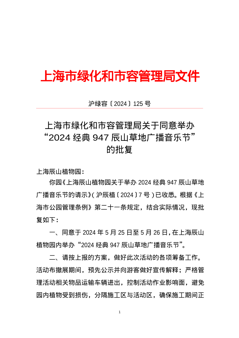 你园《上海辰山植物园关于举办 2024经典 947辰山草地广播音乐节的请示》(沪辰植〔2024〕7号)已收悉。根据《上海市公园管理条例》第二十一条规定,结合实际情况,现批复如下: