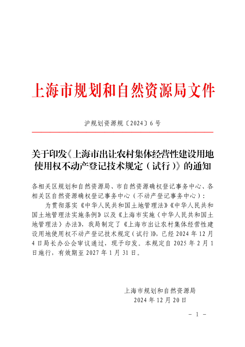 为贯彻落实《中华人民共和国土地管理法》《中华人民共和国土地管理法实施条例》以及《上海市实施〈中华人民共和国土地管理法〉办法》,我局制定了《上海市出让农村集体经营性建设用地使用权不动产登记技术规定(试行)》,已经2024年12月4日局长办公会审议通过,现予印发。本规定自2025年2月1日施行,有效期至2027年1月31日。