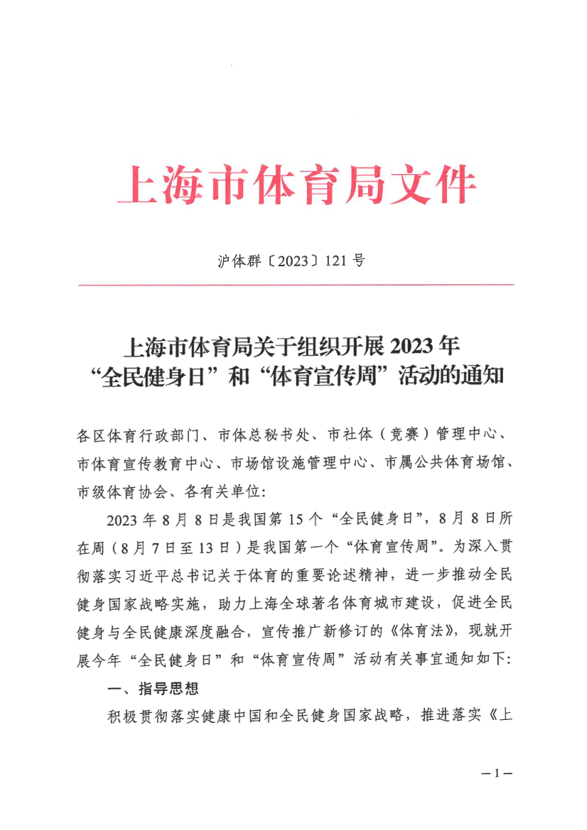 2023年8月8日是我国第15个“全民健身日”,8月8日所在周(8月7日至13日)是我国第一个“体育宣传周”。为深入贯彻落实习近平总书记关于体育的重要论述精神,进一步推动全民健身国家战略实施,助力上海全球著名体育城市建设,促进全民健身与全民健康深度融合,宣传推广新修订的《体育法》,现就开展今年“全民健身日”和“体育宣传周”活动有关事宜通知如下: