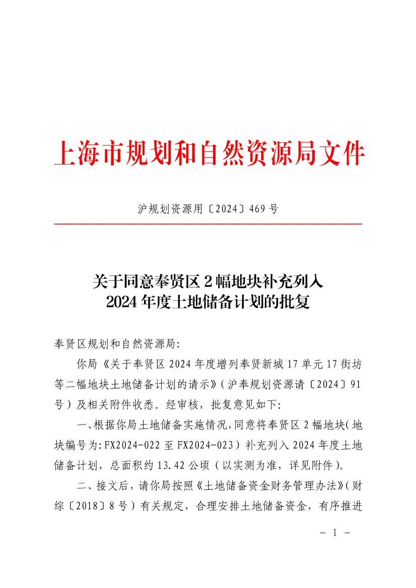 一、根据你局土地储备实施情况,同意将奉贤区2幅地块(地块编号为:FX2024-022至FX2024-023)补充列入2024年度土地储备计划,总面积约13.42公顷(以实测为准,详见附件)。
