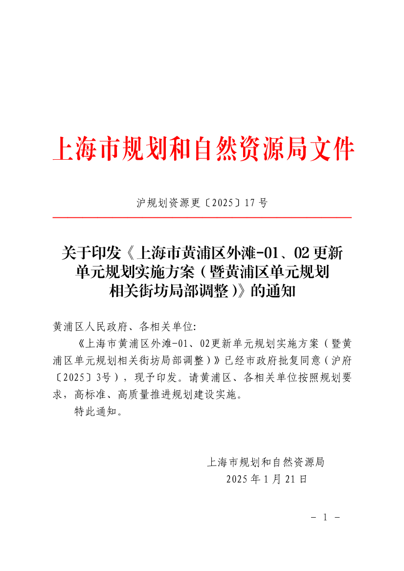《上海市黄浦区外滩-01、02更新单元规划实施方案(暨黄浦区单元规划相关街坊局部调整)》已经市政府批复同意(沪府〔2025〕3号),现予印发。请黄浦区、各相关单位按照规划要求,高标准、高质量推进规划建设实施。
