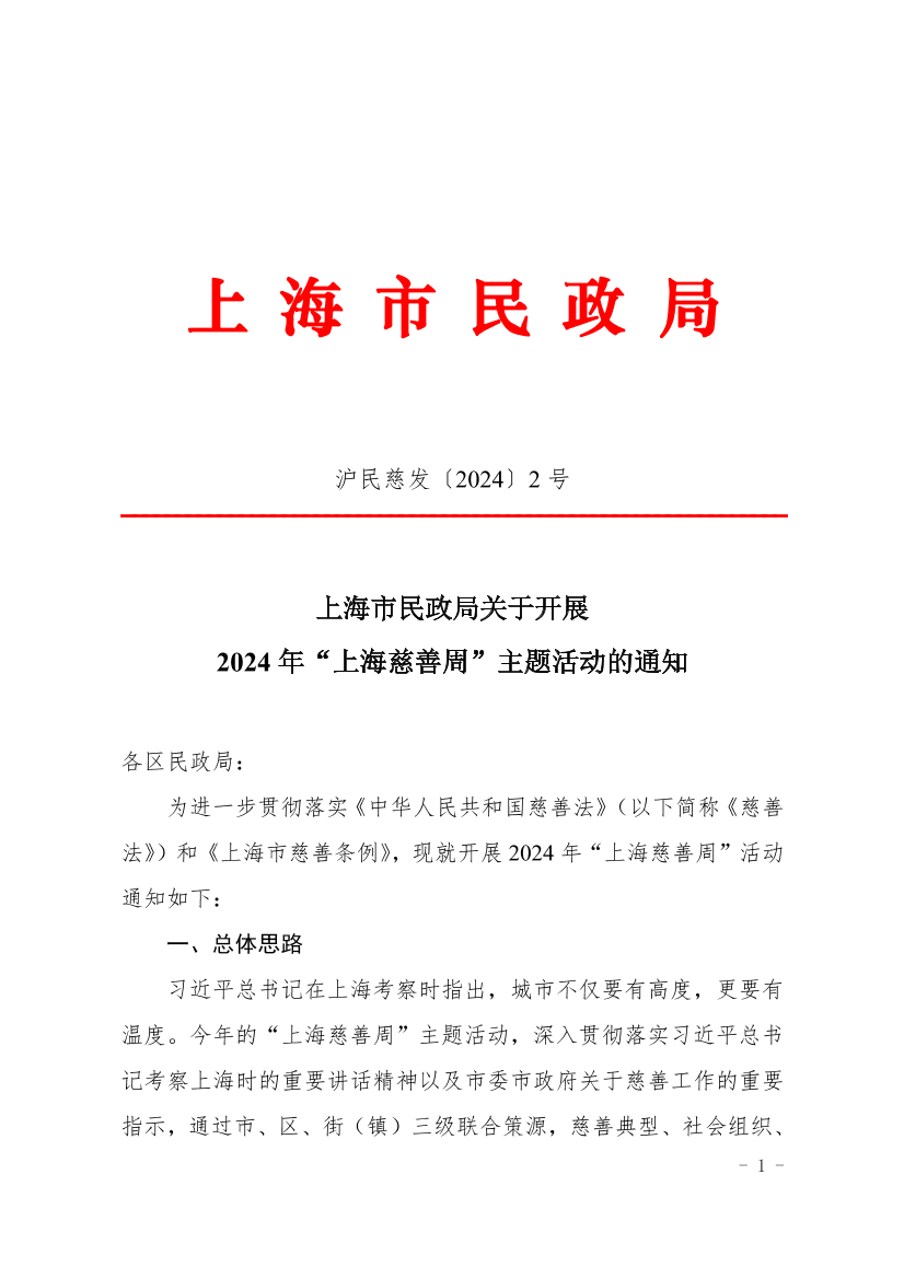 为进一步贯彻落实《中华人民共和国慈善法》(以下简称《慈善法》)和《上海市慈善条例》,现就开展2024年“上海慈善周”活动通知如下: