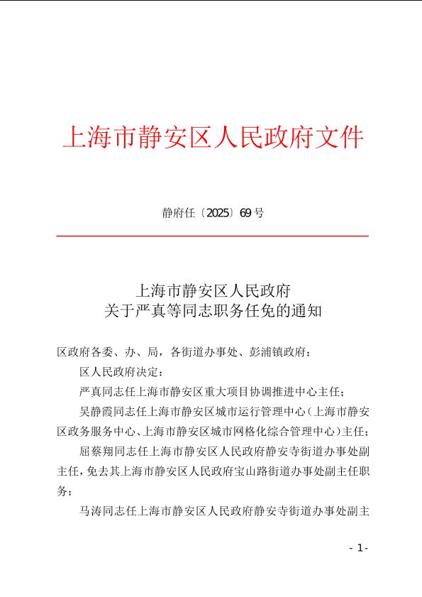 严真同志任上海市静安区重大项目协调推进中心主任;
