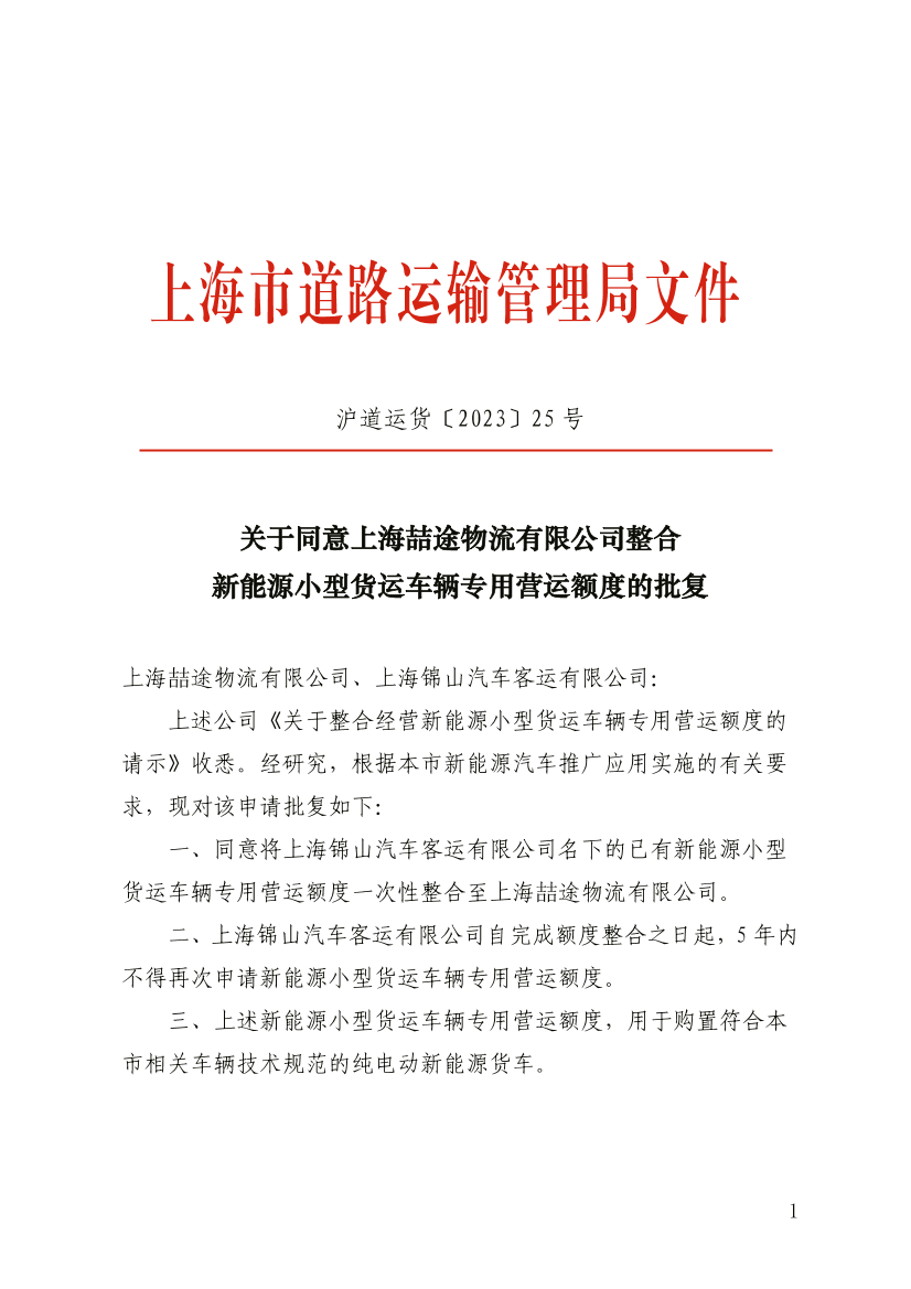 一、同意将上海锦山汽车客运有限公司名下的已有新能源小型货运车辆专用营运额度一次性整合至上海喆途物流有限公司。