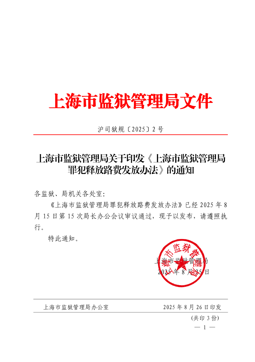 印发日期:2025-08-26 发布日期:2025-09-05 沪司狱规〔2025〕2 号