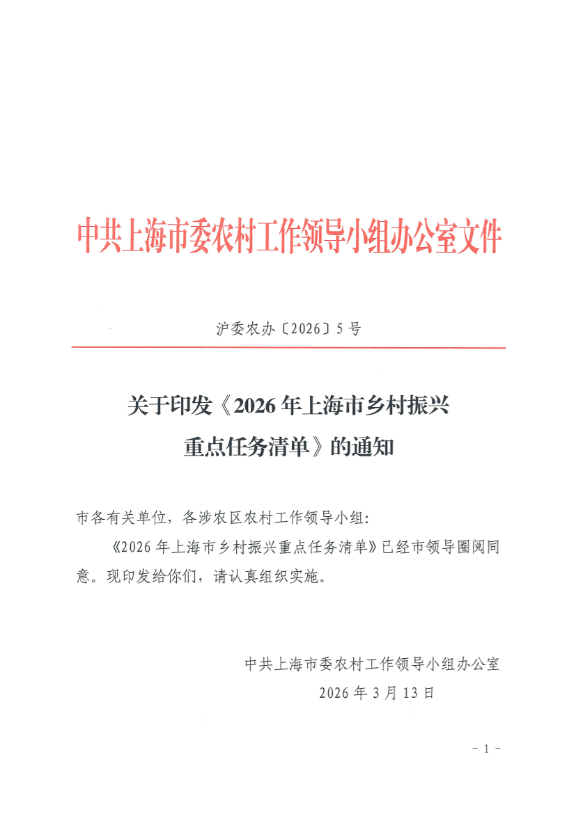 《2026年上海市乡村振兴重点任务清单》已经市领导圈阅同意。现印发给你们,请认真组织实施。