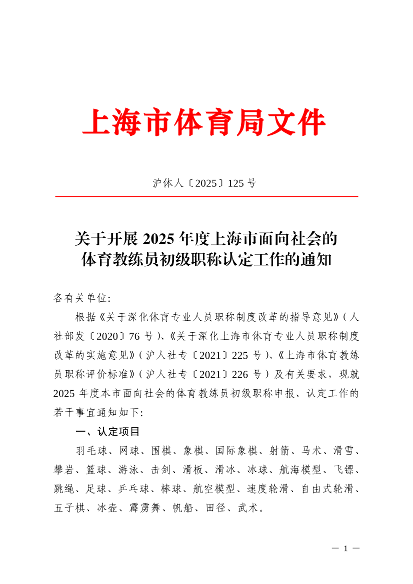 根据《关于深化体育专业人员职称制度改革的指导意见》(人社部发〔2020〕76号)、《关于深化上海市体育专业人员职称制度改革的实施意见》(沪人社专〔2021〕225号)、《上海市体育教练员职称评价标准》(沪人社专〔2021〕226号)及有关要求,现就2025年度本市面向社会的体育教练员初级职称申报、认定工作的若干事宜通知如下: