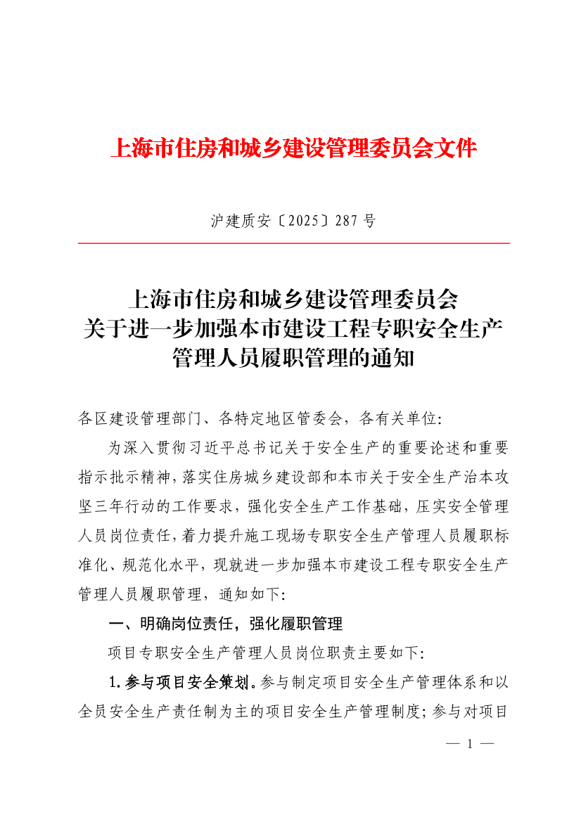 为深入贯彻习近平总书记关于安全生产的重要论述和重要指示批示精神,落实住房城乡建设部和本市关于安全生产治本攻坚三年行动的工作要求,强化安全生产工作基础,压实安全管理人员岗位责任,着力提升施工现场专职安全生产管理人员履职标准化、规范化水平,现就进一步加强本市建设工程专职安全生产管理人员履职管理,通知如下: