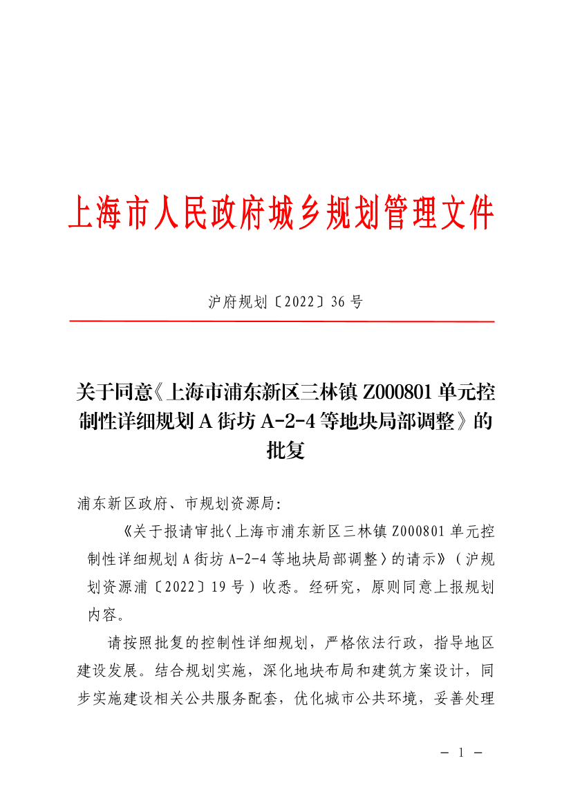 《关于报请审批〈上海市浦东新区三林镇Z000801单元控制性详细规划A街坊A-2-4等地块局部调整〉的请示》(沪规划资源浦〔2022〕19号)收悉。经研究,原则同意上报规划内容。