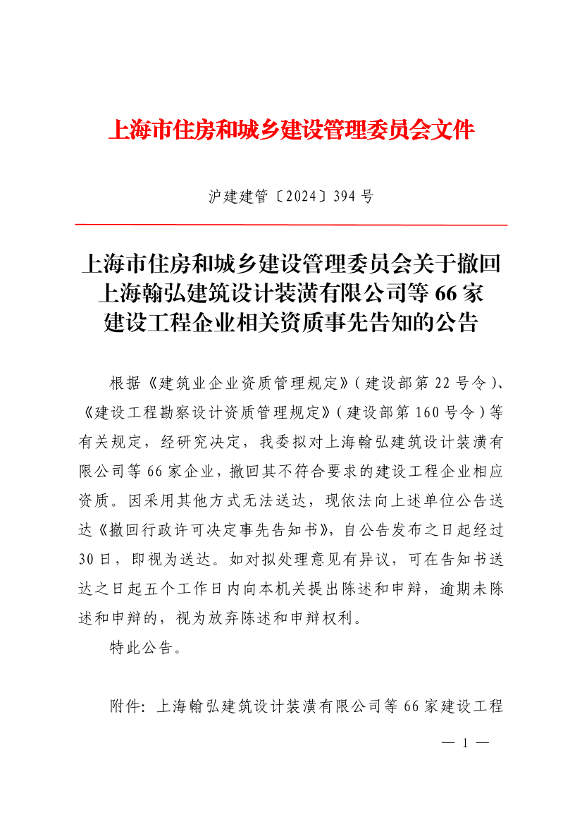 关于撤回上海翰弘建筑设计装潢有限公司等66家建设工程企业相关资质事先告知的公告