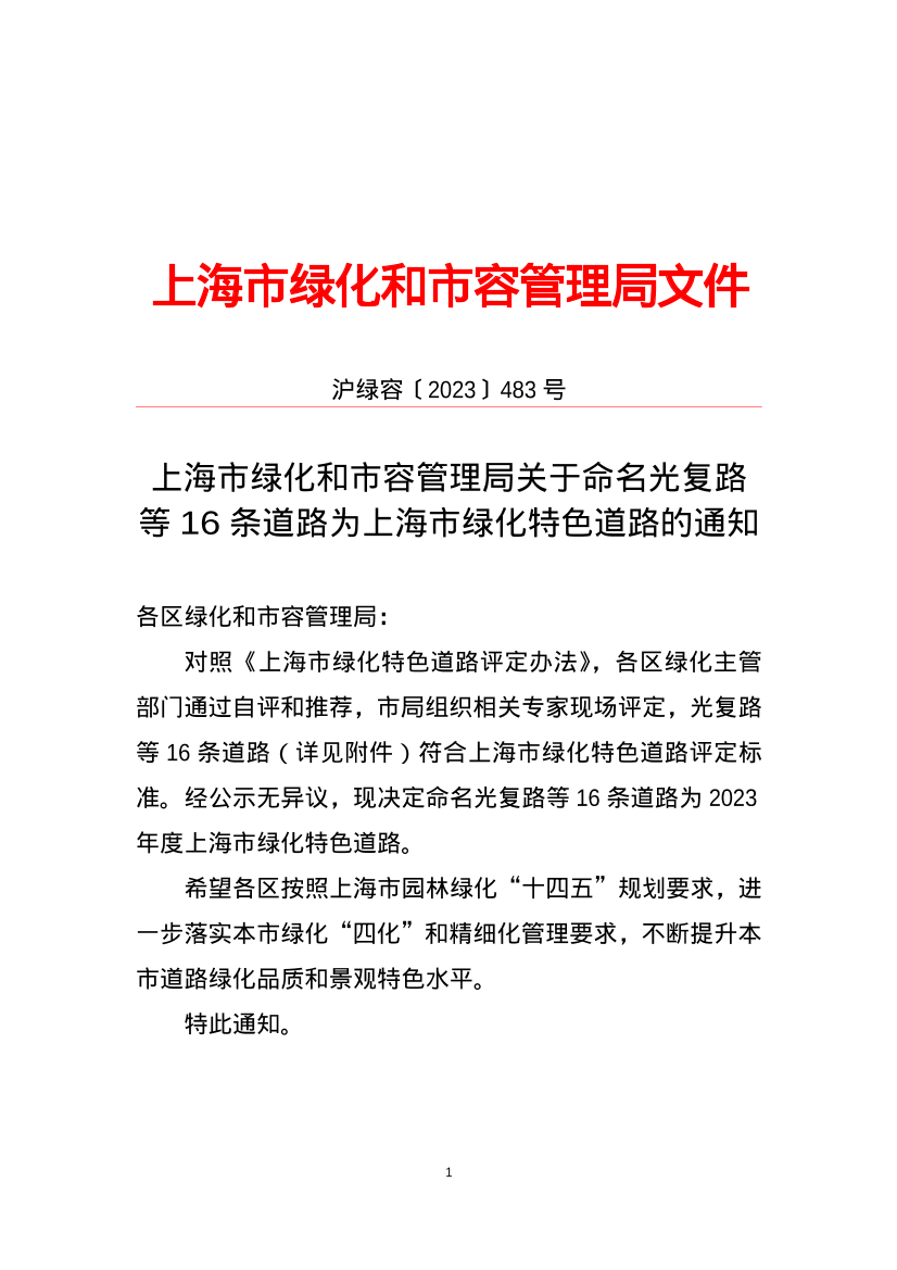 对照《上海市绿化特色道路评定办法》,各区绿化主管部门通过自评和推荐,市局组织相关专家现场评定,光复路等 16条道路(详见附件)符合上海市绿化特色道路评定标准。经公示无异议,现决定命名光复路等 16条道路为 2023年度上海市绿化特色道路。