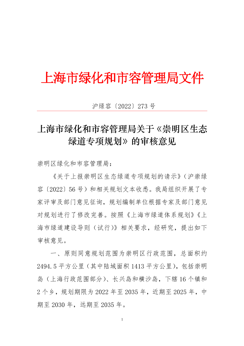 《关于上报崇明区生态绿道专项规划的请示》(沪崇绿容〔2022〕56号)和相关规划文本收悉。我局组织开展了专家评审及部门意见征询,规划编制单位根据专家及部门意见对规划进行了修改完善。按照《上海市绿道体系规划》《上海市绿道建设导则(试行)》相关要求,经研究,提出如下审核意见。