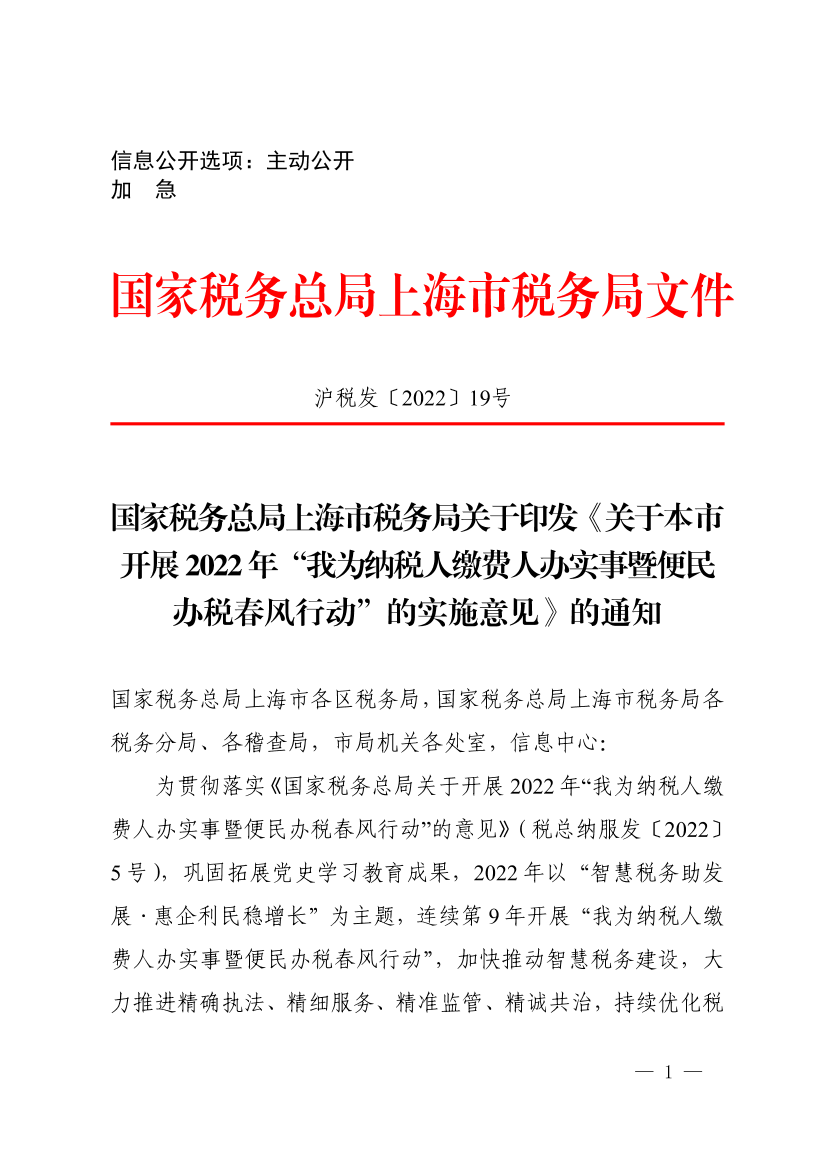 国家税务总局上海市税务局关于印发《关于本市开展2022年“我为纳税人缴费人办实事暨便民办税春风行动”的实施意见》的通知