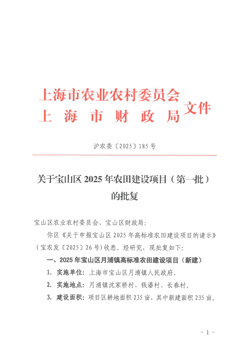 你区《关于申报宝山区2025年高标准农田建设项目的请示》(宝农发〔2025〕26号)收悉。经研究,现批复如下: