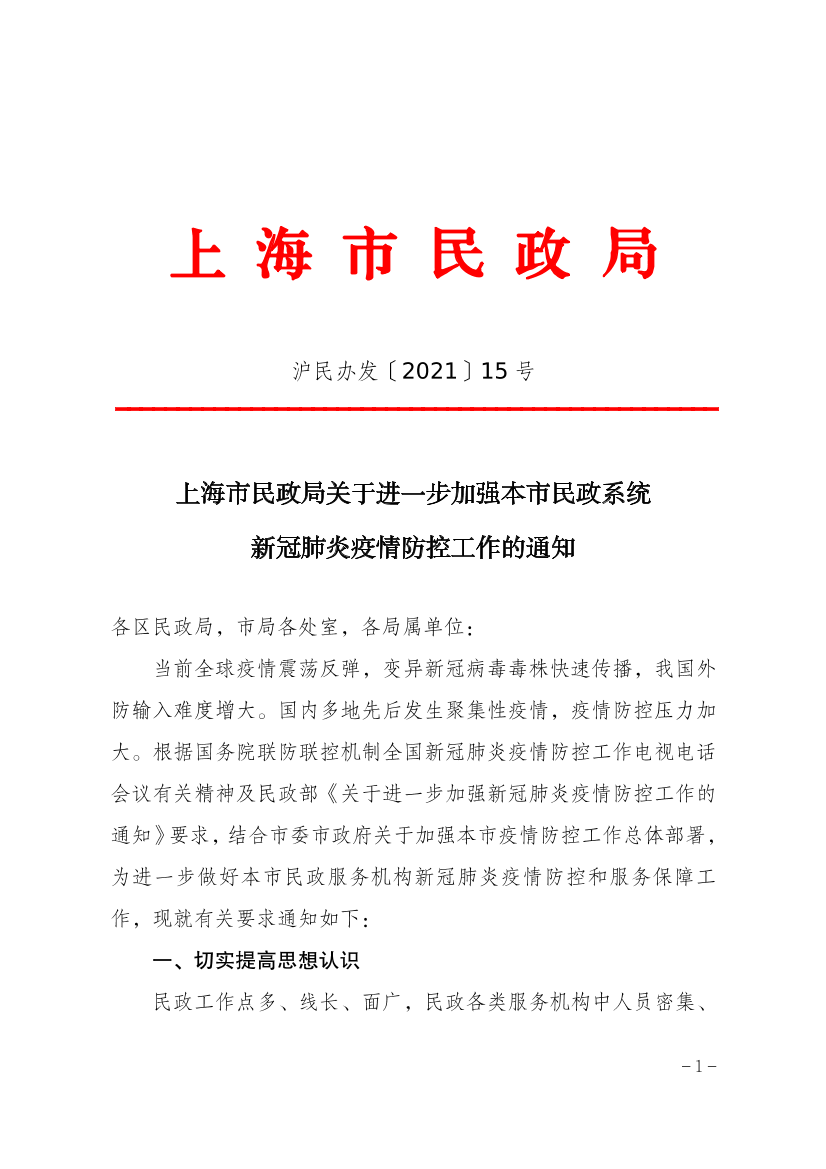 当前全球疫情震荡反弹,变异新冠病毒毒株快速传播,我国外防输入难度增大。国内多地先后发生聚集性疫情,疫情防控压力加大。根据国务院联防联控机制全国新冠肺炎疫情防控工作电视电话会议有关精神及民政部《关于进一步加强新冠肺炎疫情防控工作的通知》要求,结合市委市政府关于加强本市疫情防控工作总体部署,为进一步做好本市民政服务机构新冠肺炎疫情防控和服务保障工作,现就有关要求通知如下: