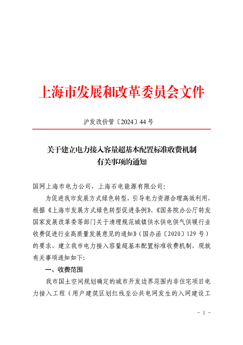 为促进我市发展方式绿色转型,引导电力资源合理高效利用,根据《上海市发展方式绿色转型促进条例》、《国务院办公厅转发国家发展改革委等部门关于清理规范城镇供水供电供气供暖行业收费促进行业高质量发展意见的通知》(国办函〔2020〕129号)的要求,建立我市电力接入容量超基本配置标准收费机制,现就有关事项通知如下: