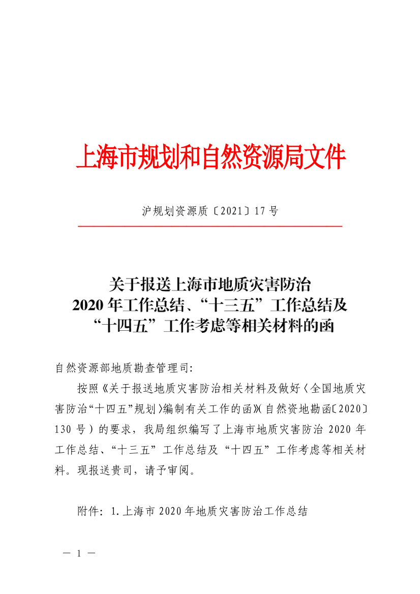 附件:1.上海市2020年地质灾害防治工作总结