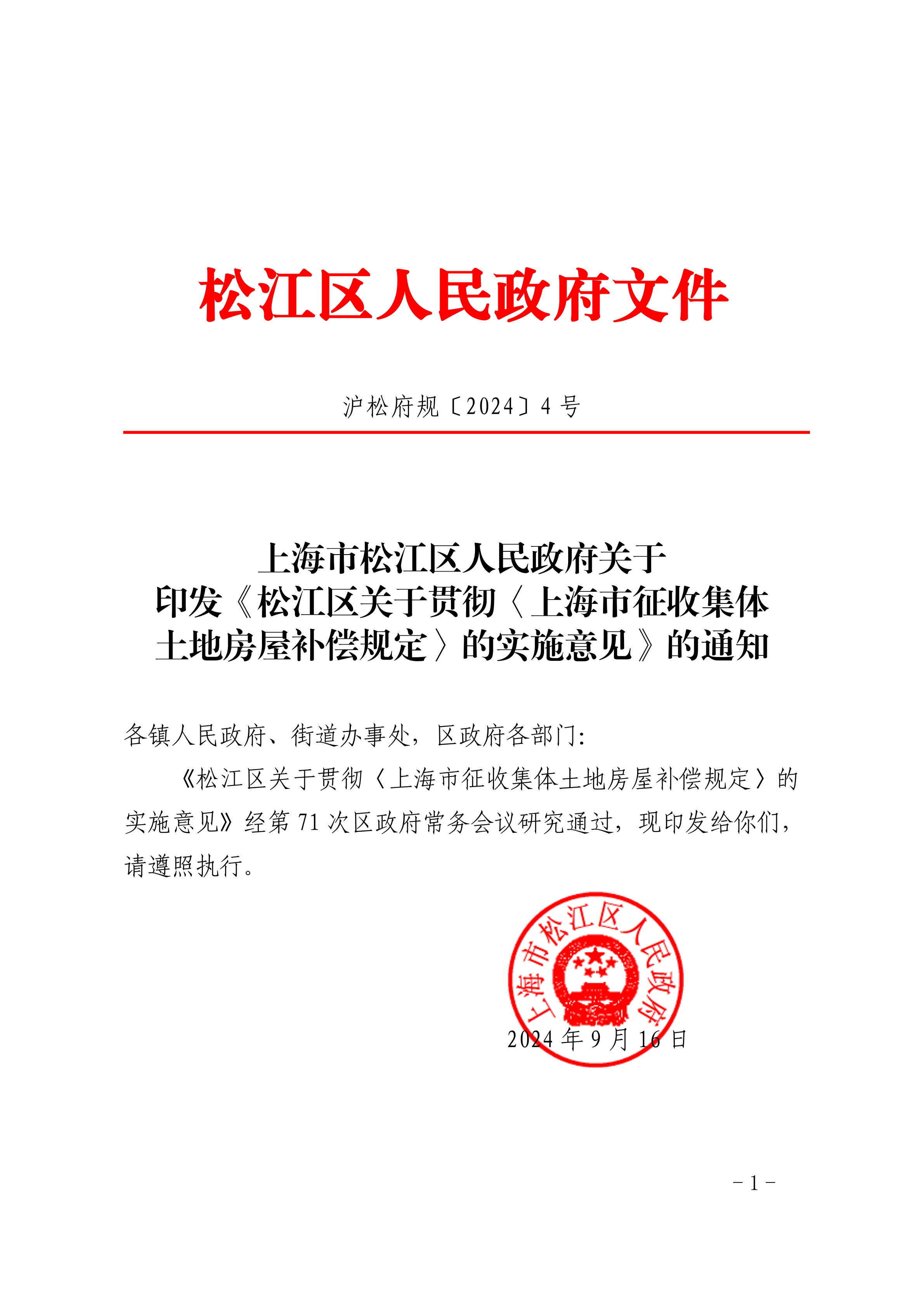 《松江区关于贯彻〈上海市征收集体土地房屋补偿规定〉的实施意见》经第71次区政府常务会议研究通过,现印发给你们,请遵照执行。