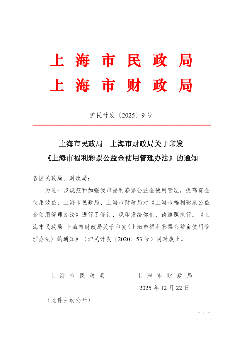 为进一步规范和加强我市福利彩票公益金使用管理,提高资金使用效益,上海市民政局、上海市财政局对《上海市福利彩票公益金使用管理办法》进行了修订,现印发给你们,请遵照执行。《上海市民政局 上海市财政局关于印发〈上海市福利彩票公益金使用管理办法〉的通知》(沪民计发〔2020〕53号)同时废止。