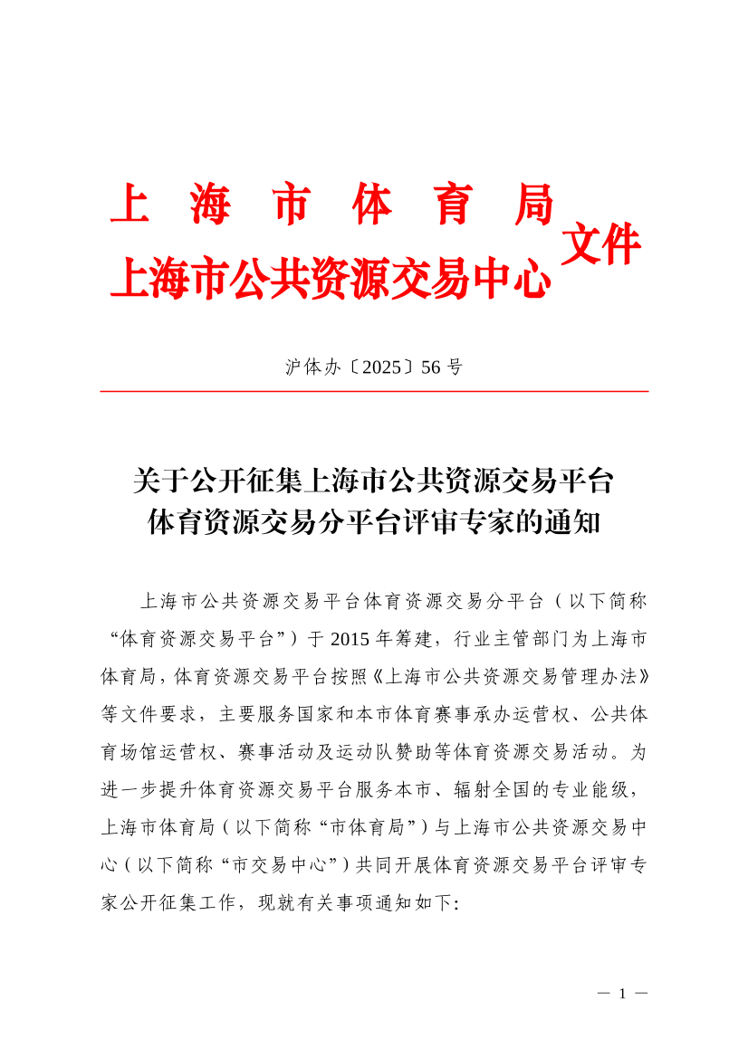 上海市公共资源交易平台体育资源交易分平台(以下简称“体育资源交易平台”)于2015年筹建,行业主管部门为上海市体育局,体育资源交易平台按照《上海市公共资源交易管理办法》等文件要求,主要服务国家和本市体育赛事承办运营权、公共体育场馆运营权、赛事活动及运动队赞助等体育资源交易活动。为进一步提升体育资源交易平台服务本市、辐射全国的专业能级,上海市体育局(以下简称“市体育局”)与上海市公共资源交易中心(以下简称“市交易中心”)共同开展体育资源交易平台评审专家公开征集工作,现就有关事项通知如下: