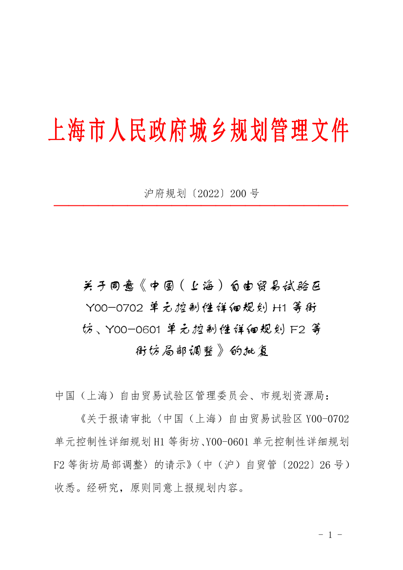 《关于报请审批〈中国(上海)自由贸易试验区Y00-0702单元控制性详细规划H1等街坊、Y00-0601单元控制性详细规划F2等街坊局部调整〉的请示》(中(沪)自贸管〔2022〕26号)收悉。经研究,原则同意上报规划内容。
