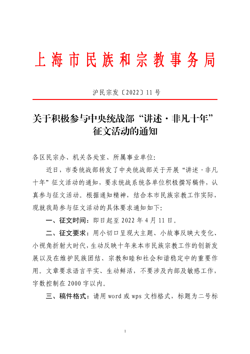 近日,市委统战部转发了中央统战部关于开展“讲述·非凡十年”征文活动的通知,要求统战系统各单位积极撰写稿件,认真参与征文活动。根据通知精神,结合本市民族宗教工作实际,现就我局参与征文活动的具体要求通知如下: