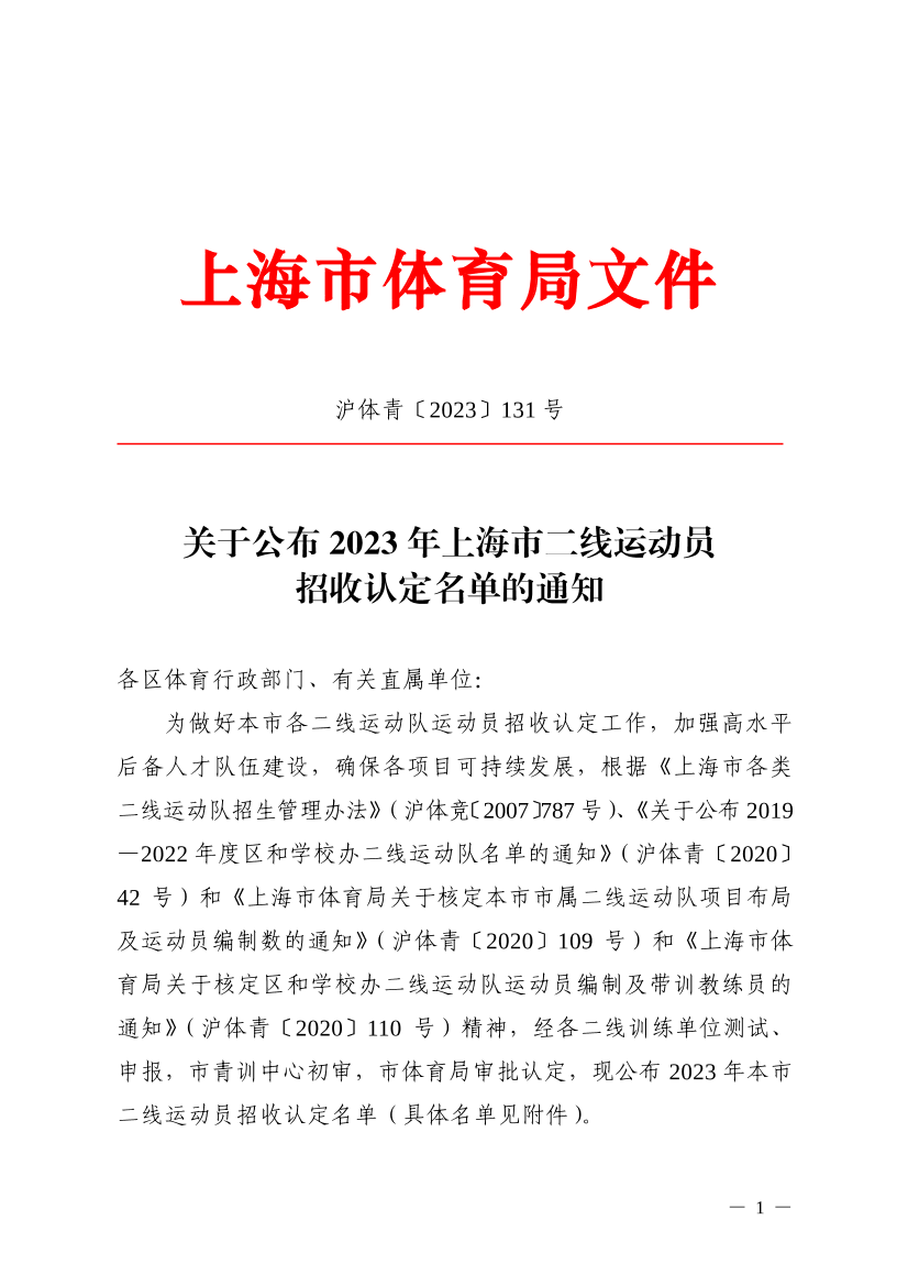 为做好本市各二线运动队运动员招收认定工作,加强高水平后备人才队伍建设,确保各项目可持续发展,根据《上海市各类二线运动队招生管理办法》(沪体竞〔2007〕787号)、《关于公布2019—2022年度区和学校办二线运动队名单的通知》(沪体青〔2020〕42号)和《上海市体育局关于核定本市市属二线运动队项目布局及运动员编制数的通知》(沪体青〔2020〕109号)和《上海市体育局关于核定区和学校办二线运动队运动员编制及带训教练员的通知》(沪体青〔2020〕110号)精神,经各二线训练单位测试、申报,市青训中心初审,市体育局审批认定,现公布2023年本市二线运动员招收认定名单(具体名单见附件)。