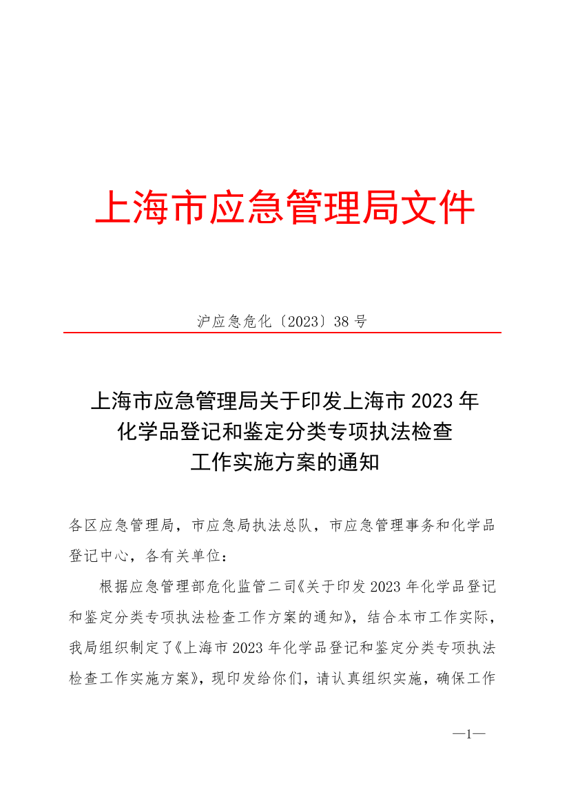 根据应急管理部危化监管二司《关于印发2023年化学品登记和鉴定分类专项执法检查工作方案的通知》,结合本市工作实际,我局组织制定了《上海市2023年化学品登记和鉴定分类专项执法检查工作实施方案》,现印发给你们,请认真组织实施,确保工作取得实效。工作推进过程中遇到问题,请及时反馈。