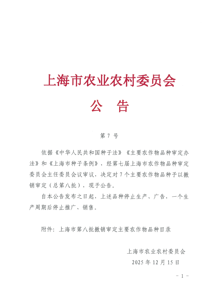 依据《中华人民共和国种子法》《主要农作物品种审定办法》和《上海市种子条例》,经第七届上海市农作物品种审定委员会主任委员会议审议,决定对7个主要农作物品种予以撤销审定(总第八批),现予公告。