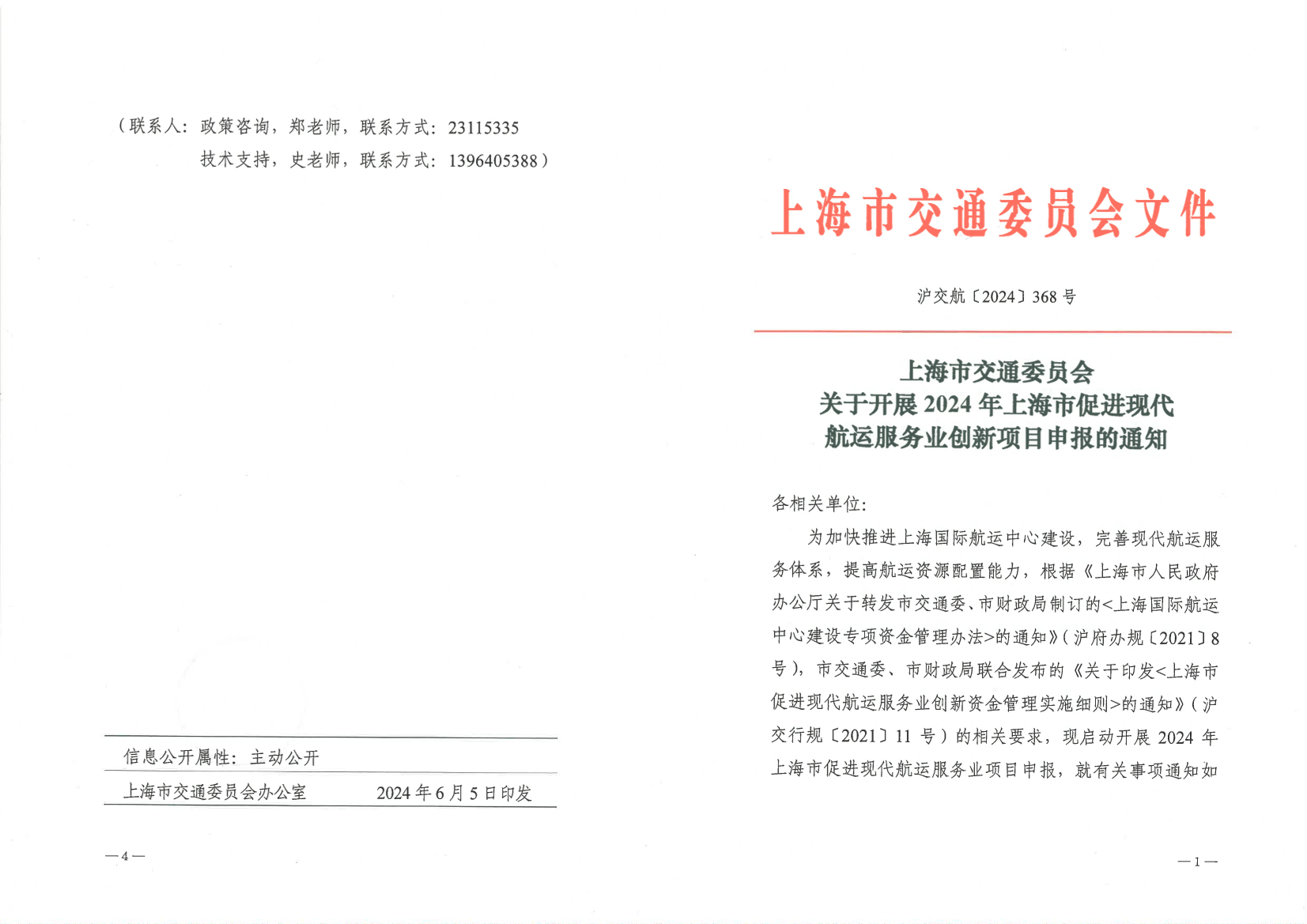 为加快推进上海国际航运中心建设,完善现代航运服务体系,提高航运资源配置能力,根据《上海市人民政府办公厅关于转发市交通委、市财政局制订的<上海国际航运中心建设专项资金管理办法>的通知》(沪府办规〔2021〕8号),市交通委、市财政局联合发布的《关于印发<上海市促进现代航运服务业创新资金管理实施细则>的通知》(沪交行规〔2021〕11号)的相关要求,现启动开展2024年上海市促进现代航运服务业项目申报,就有关事项通知如下: