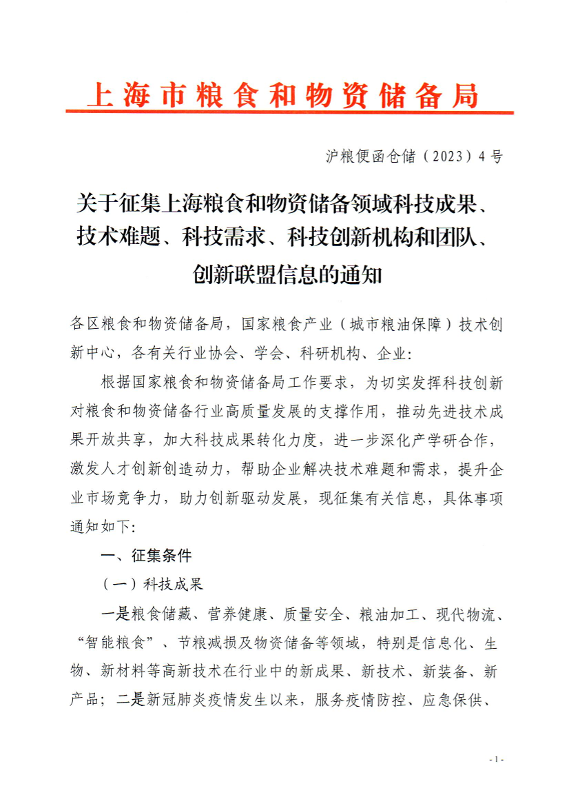根据国家粮食和物资储备局工作要求,为切实发挥科技创新对粮食和物资储备行业高质量发展的支撑作用,推动先进技术成果开放共享,加大科技成果转化力度,进一步深化产学研合作,激发人才创新创造动力,帮助企业解决技术难题和需求,提升企业市场竞争力,助力创新驱动发展,现征集有关信息,具体事项通知如下: