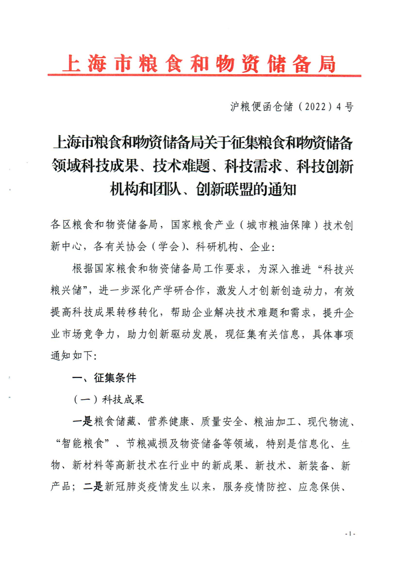 根据国家粮食和物资储备局工作要求,为深入推进“科技兴粮兴储”,进一步深化产学研合作,激发人才创新创造动力,有效提高科技成果转移转化,帮助企业解决技术难题和需求,提升企业市场竞争力,助力创新驱动发展,现征集有关信息,具体事项通知如下: