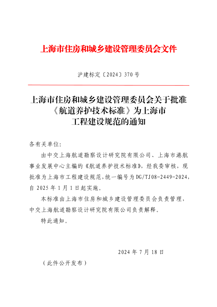 由中交上海航道勘察设计研究院有限公司、上海市港航事业发展中心主编的《航道养护技术标准》,经我委审核,现批准为上海市工程建设规范,统一编号为DG/TJ08-2449-2024,自2025年1月1日起实施。