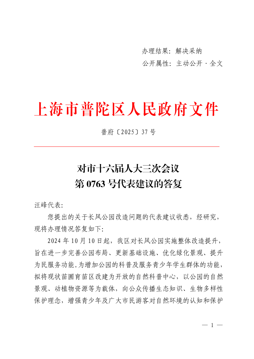 您提出的关于长风公园改造问题的代表建议收悉,经研究,现将办理情况答复如下:
