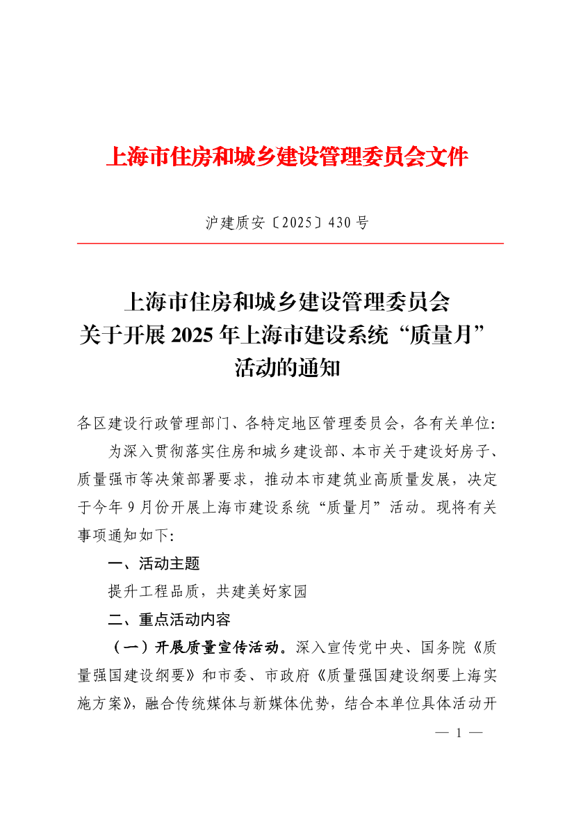 关于开展2025年上海市建设系统“质量月”活动的通知