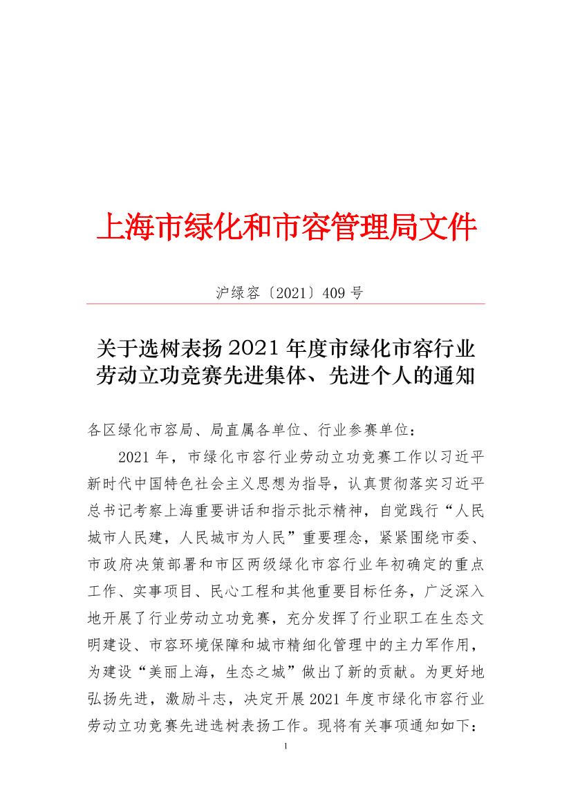 2021年,市绿化市容行业劳动立功竞赛工作以习近平新时代中国特色社会主义思想为指导,认真贯彻落实习近平总书记考察上海重要讲话和指示批示精神,自觉践行“人民城市人民建,人民城市为人民”重要理念,紧紧围绕市委、市政府决策部署和市区两级绿化市容行业年初确定的重点工作、实事项目、民心工程和其他重要目标任务,广泛深入地开展了行业劳动立功竞赛,充分发挥了行业职工在生态文明建设、市容环境保障和城市精细化管理中的主力军作用,为建设“美丽上海,生态之城”做出了新的贡献。为更好地弘扬先进,激励斗志,决定开展2021年度市绿化市容行业劳动立功竞赛先进选树表扬工作。现将有关事项通知如下: