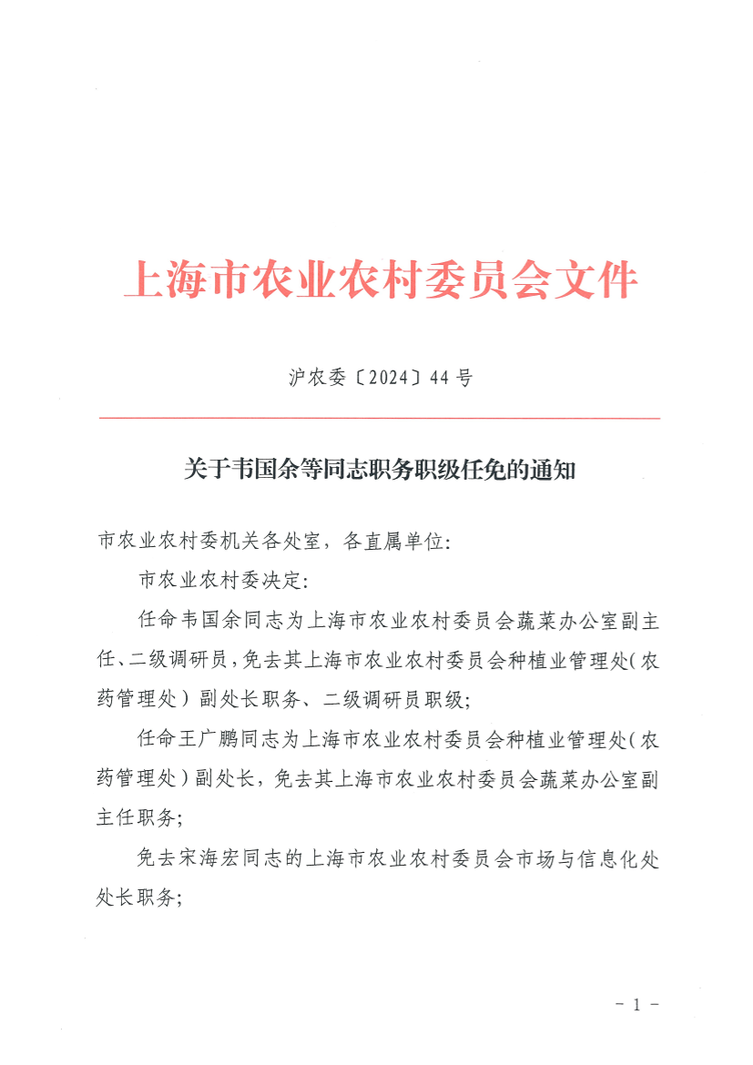 任命韦国余同志为上海市农业农村委员会蔬菜办公室副主任、二级调研员,免去其上海市农业农村委员会种植业管理处(农药管理处)副处长职务、二级调研员职级;