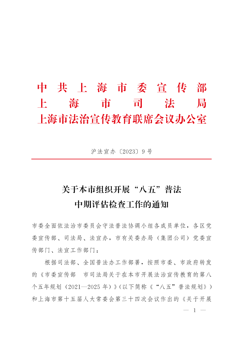 根据司法部、全国普法办工作部署,按照市委、市政府转发的《市委宣传部 市司法局关于在本市开展法治宣传教育的第八个五年规划(2021—2025年)》(以下简称《“八五”普法规划》)和上海市第十五届人大常委会第三十四次会议作出的《关于开展第八个五年法治宣传教育的决议》(以下简称《决议》)要求,经市委全面依法治市委员会守法普法协调小组领导同意,决定对各区、各部门、各单位贯彻执行《“八五”普法规划》和《决议》情况进行评估检查。现将有关事项通知如下: