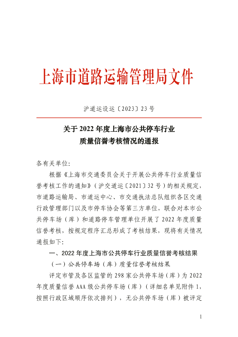 根据《上海市交通委员会关于开展公共停车行业质量信誉考核工作的通知》(沪交道运〔2021〕32号)的相关规定,市道路运输局、市道运中心、市交通执法总队组织各区交通行政管理部门以及市停车协会等第三方单位,联合对本市公共停车场(库)和道路停车管理单位开展了2022年度质量信誉考核,按规定程序汇总形成了考核结果,现将有关情况通报如下: