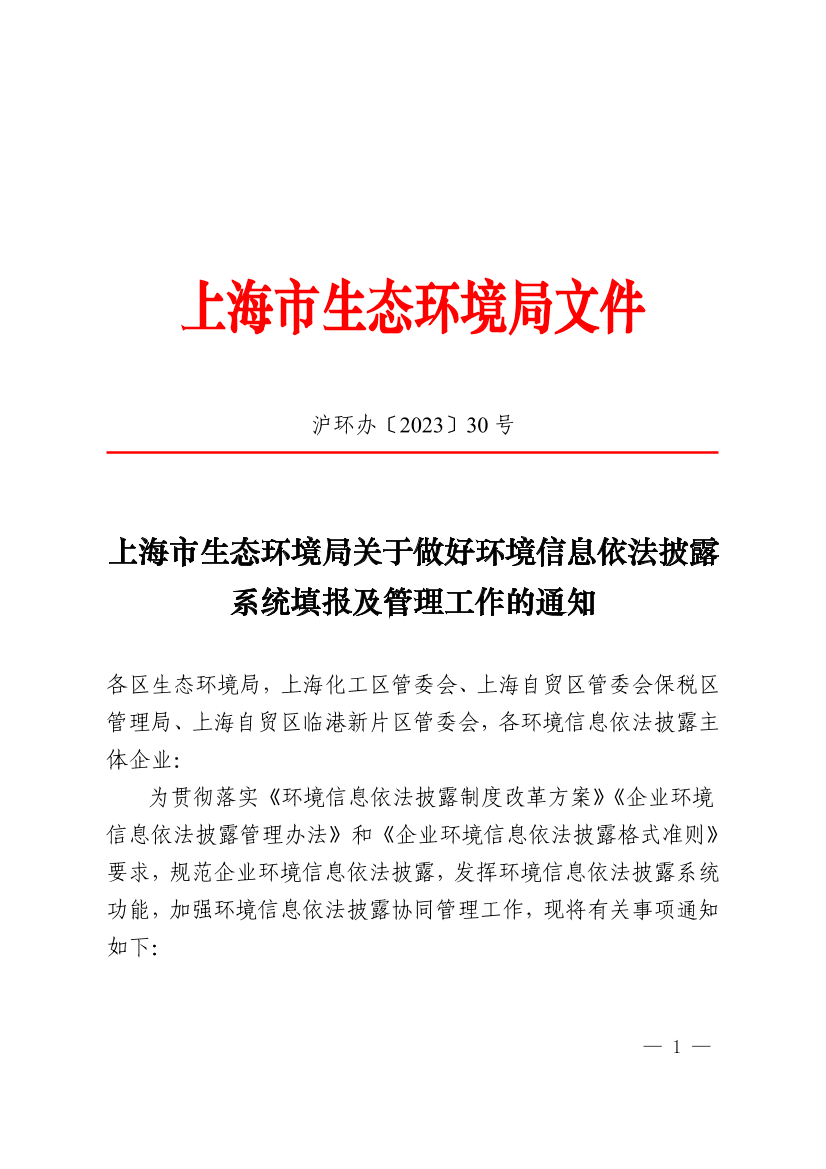各区生态环境局,上海化工区管委会、上海自贸区管委会保税区管理局、上海自贸区临港新片区管委会,各环境信息依法披露主体企业: