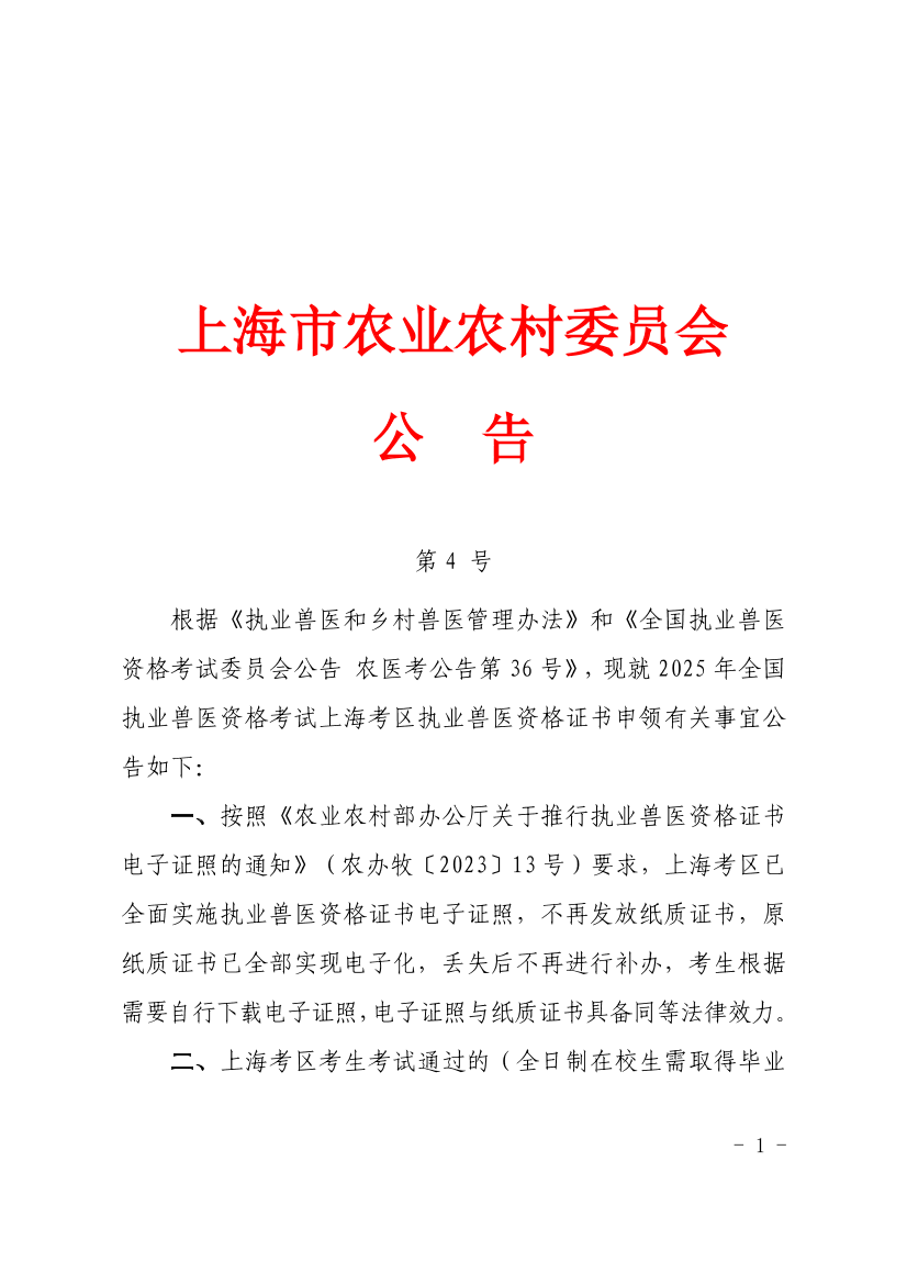 根据《执业兽医和乡村兽医管理办法》和《全国执业兽医资格考试委员会公告 农医考公告第36号》,现就2025年全国执业兽医资格考试上海考区执业兽医资格证书申领有关事宜公告如下: