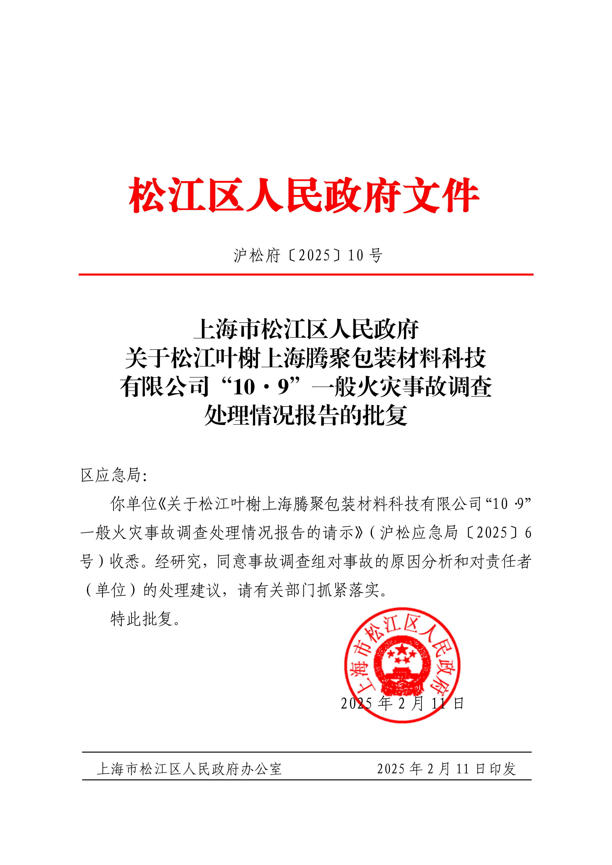 你单位《关于松江叶榭上海腾聚包装材料科技有限公司“10·9”一般火灾事故调查处理情况报告的请示》(沪松应急局〔2025〕6号)收悉。经研究,同意事故调查组对事故的原因分析和对责任者(单位)的处理建议,请有关部门抓紧落实。