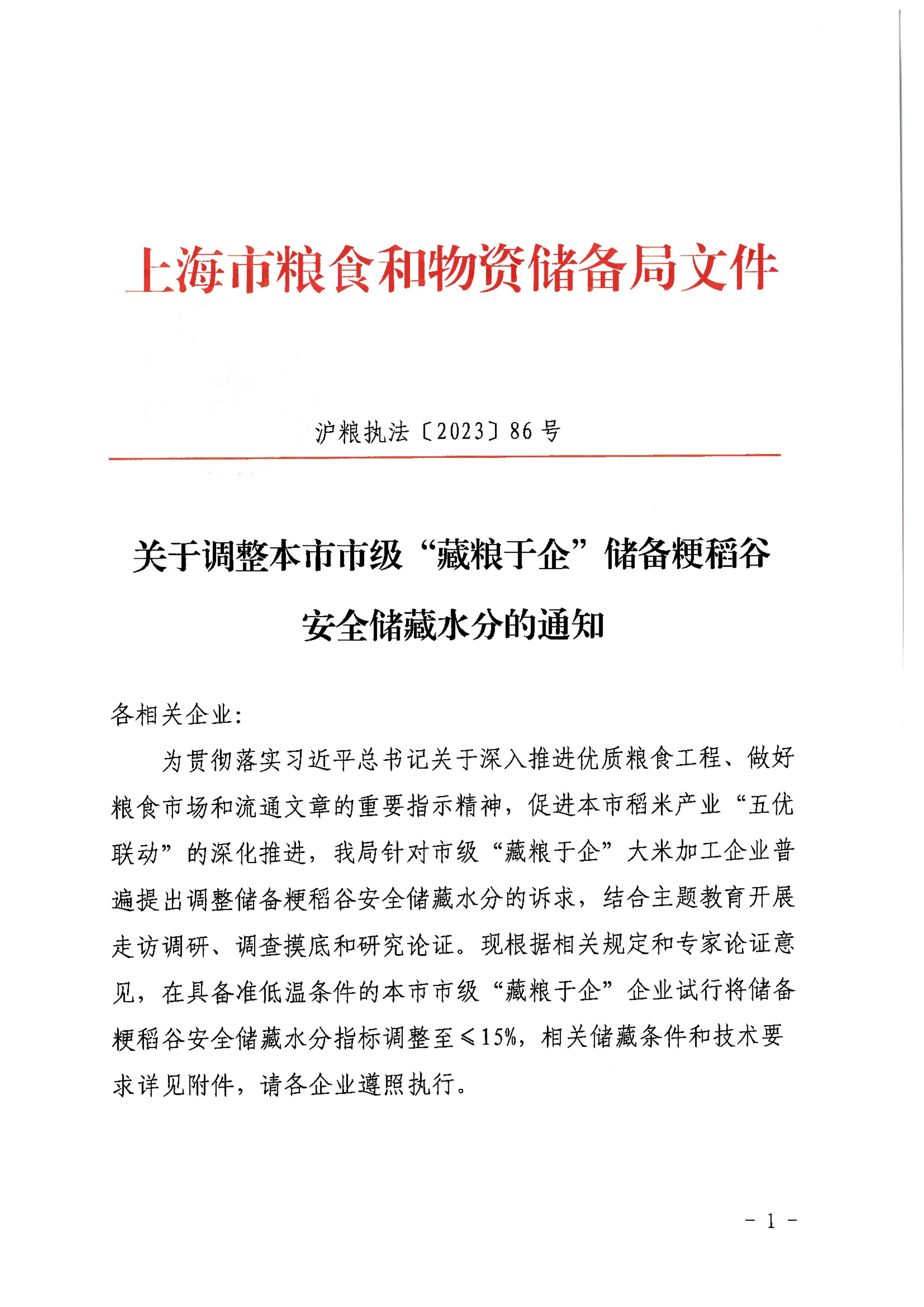 为贯彻落实习近平总书记关于深入推进优质粮食工程、做好粮食市场和流通文章的重要指示精神,促进本市稻米产业“五优联动”的深化推进,我局针对市级“藏粮于企”大米加工企业普遍提出调整储备粳稻谷安全储藏水分的诉求,结合主题教育开展走访调研、调查摸底和研究论证。现根据相关规定和专家论证意见,在具备准低温条件的本市市级“藏粮于企”企业试行将储备粳稻谷安全储藏水分指标调整至≤15%,相关储藏条件和技术要求详见附件,请各企业遵照执行。