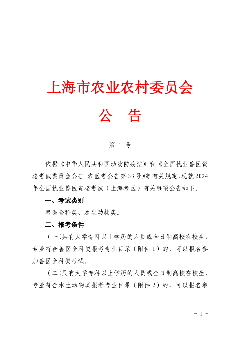 依据《中华人民共和国动物防疫法》和《全国执业兽医资格考试委员会公告 农医考公告第33号》等有关规定,现就2024年全国执业兽医资格考试(上海考区)有关事项公告如下。