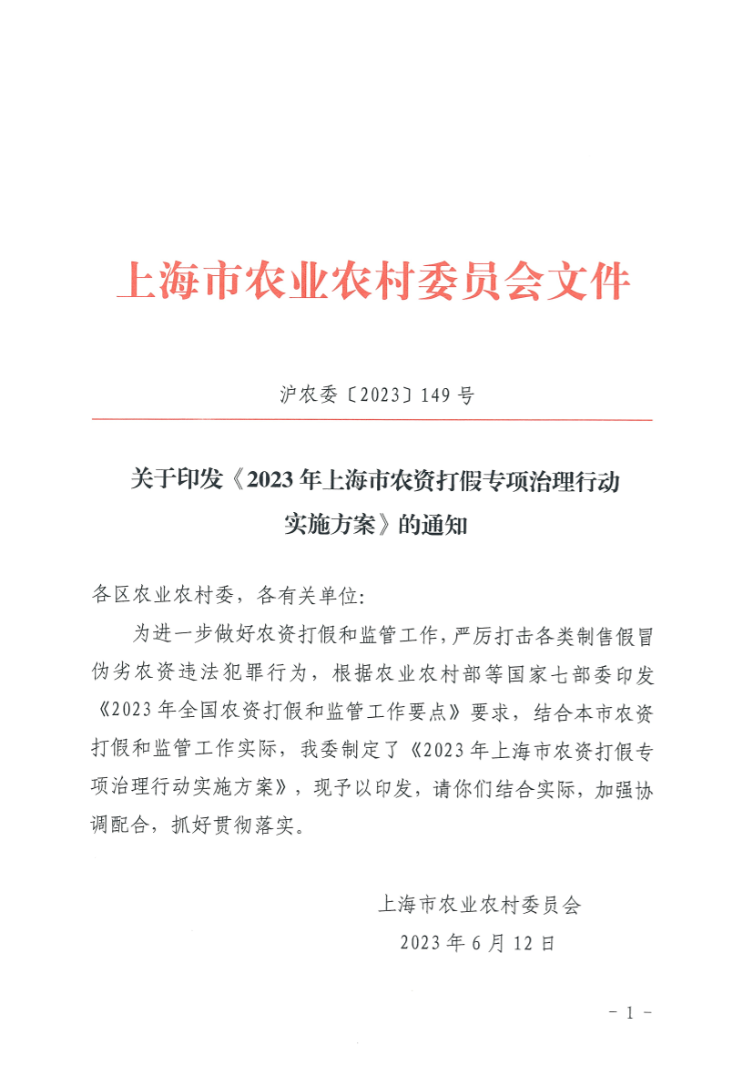 为进一步做好农资打假和监管工作,严厉打击各类制售假冒伪劣农资违法犯罪行为,根据农业农村部等国家七部委印发《2023年全国农资打假和监管工作要点》要求,结合本市农资打假和监管工作实际,我委制定了《2023年上海市农资打假专项治理行动实施方案》,现予以印发,请你们结合实际,加强协调配合,抓好贯彻落实。