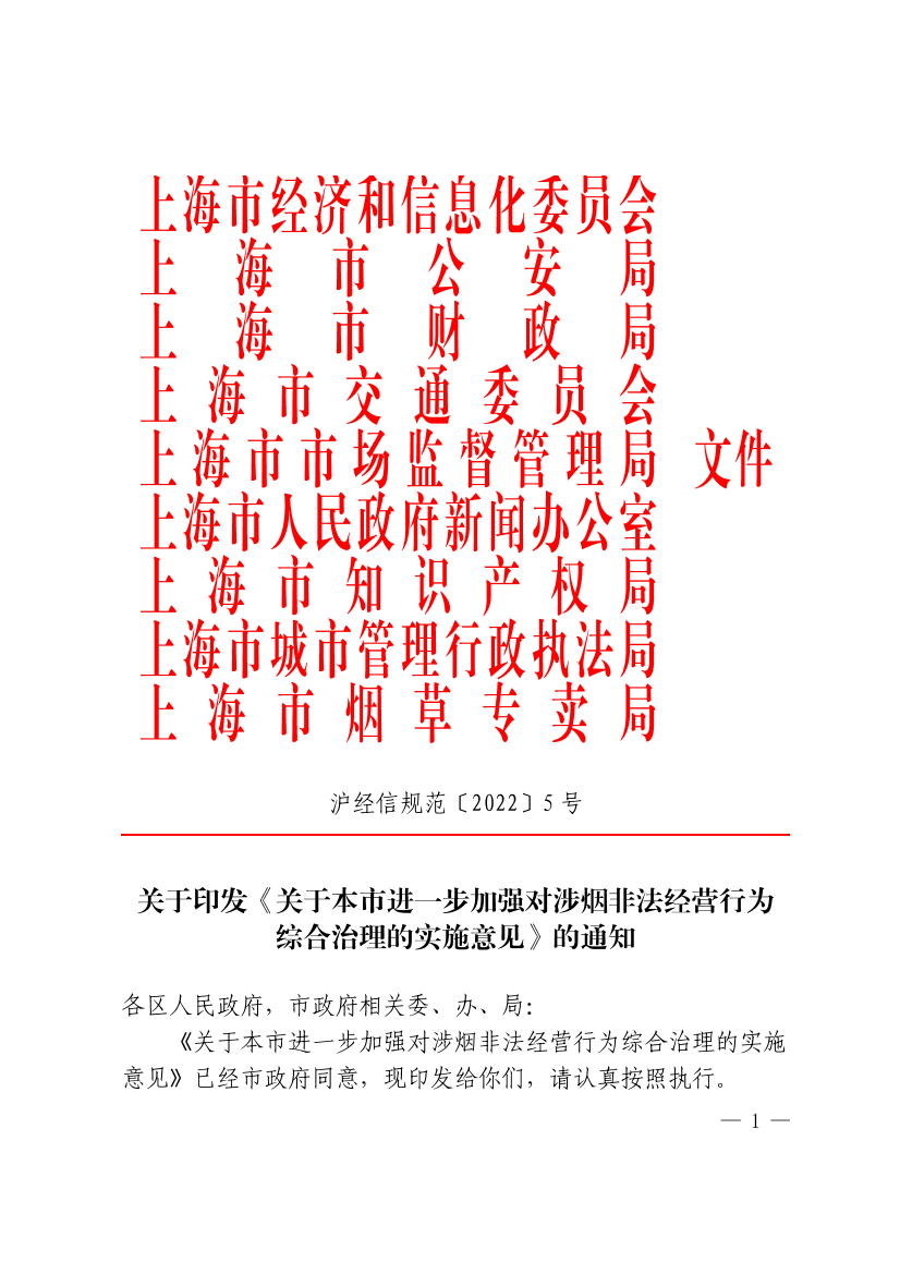 《关于本市进一步加强对涉烟非法经营行为综合治理的实施意见》已经市政府同意,现印发给你们,请认真按照执行。
